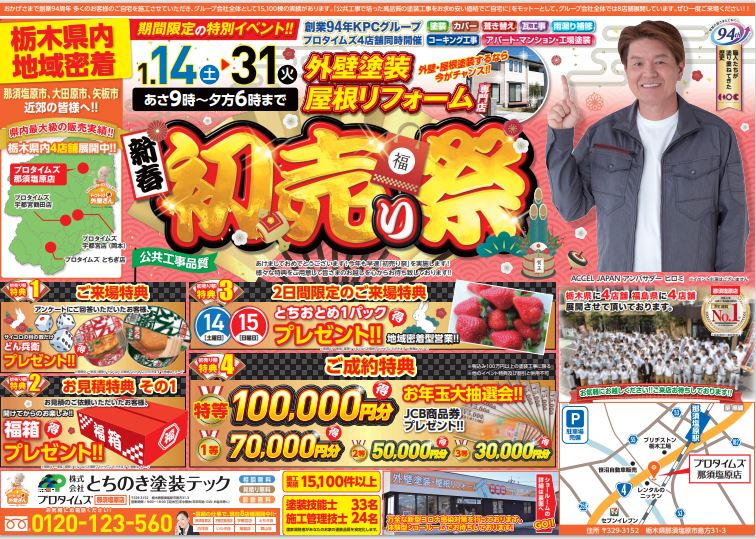 新春初売り祭!!(江連)屋根塗装・外壁塗装・防水工事・雨漏り対策はとちのき塗装テック【大田原市】 2023年01月15日(日) 那須塩原市・大田原市・矢板市・那須町近辺のみなさん、こんにちは! 外壁塗装・屋根塗装専門店のとちのき塗装テックです! 今回のブログを執筆させていただく那須塩原支店の江連です! とちのき塗装テック那須塩原店では1月14・・・