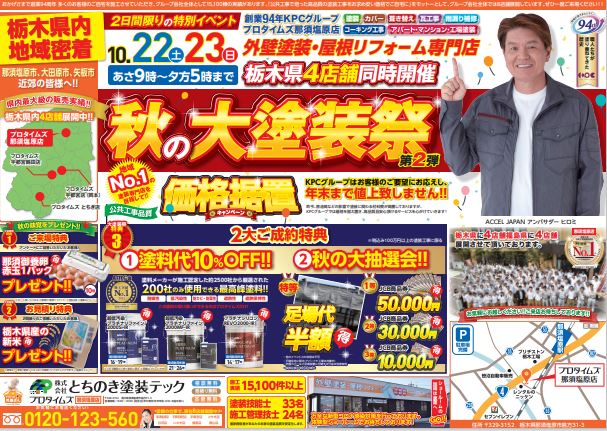 10/22(土)・23(日) 秋の大塗装祭 第二弾!! 2022年10月20日(木) 那須塩原市の屋根塗装・外壁塗装はプロタイムズ那須塩原店へ! スタッフブログをご覧いただきありがとうございます。 栃木県那須塩原市の塗装会社 プロタイムズ那須塩原店 株式会社とちのき塗装テックの田子です。 本・・・