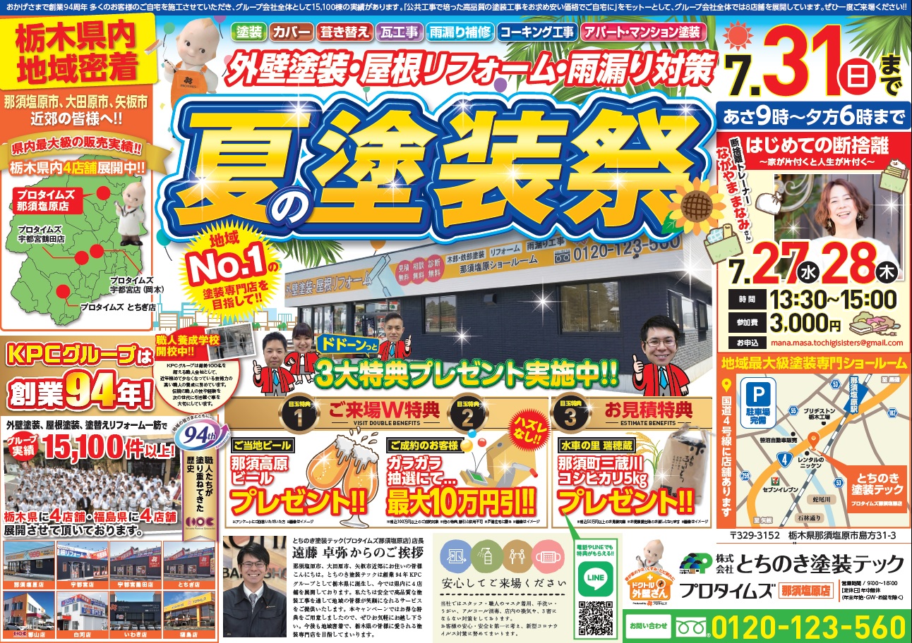 7/27(水)・28(木)断捨離セミナーを行います!! 2022年07月16日(土) 那須塩原市の屋根塗装・外壁塗装はプロタイムズ那須塩原店へ! スタッフブログをご覧いただきありがとうございます。 栃木県那須塩原市の塗装会社 プロタイムズ那須塩原店 株式会社とちのき塗装テックの小野崎です。 ・・・