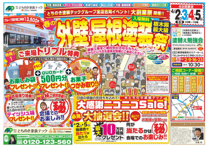【那須塩原市】お得な企画盛りだくさん!!春のイベント開催!(田子)那須塩原市・大田原市・矢板市・那須町近辺の屋根塗装、外壁塗装ならとちのき塗装テック 2021年03月28日(日) 那須塩原市の屋根塗装・外壁塗装は(株)とちのき塗装テックへ! スタッフブログをご覧いただきありがとうございます。 (株)とちのき塗装テック(プロタイムズ那須塩原店)の田子です。 本日は4月に開・・・