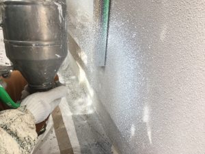 ひび割れ補修をしたところだけ、もともとのリシンの粒がない状態ですので、補修跡がフラットになって目立ってしまいます。この工程を行うことで、ひび割れを目立ちにくくします。