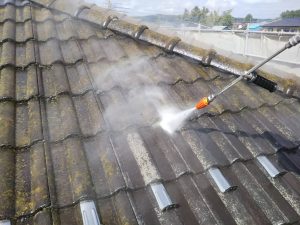 昨日から、大田原市でモニエル瓦の住宅の塗装を行っています。洗浄作業の様子です。