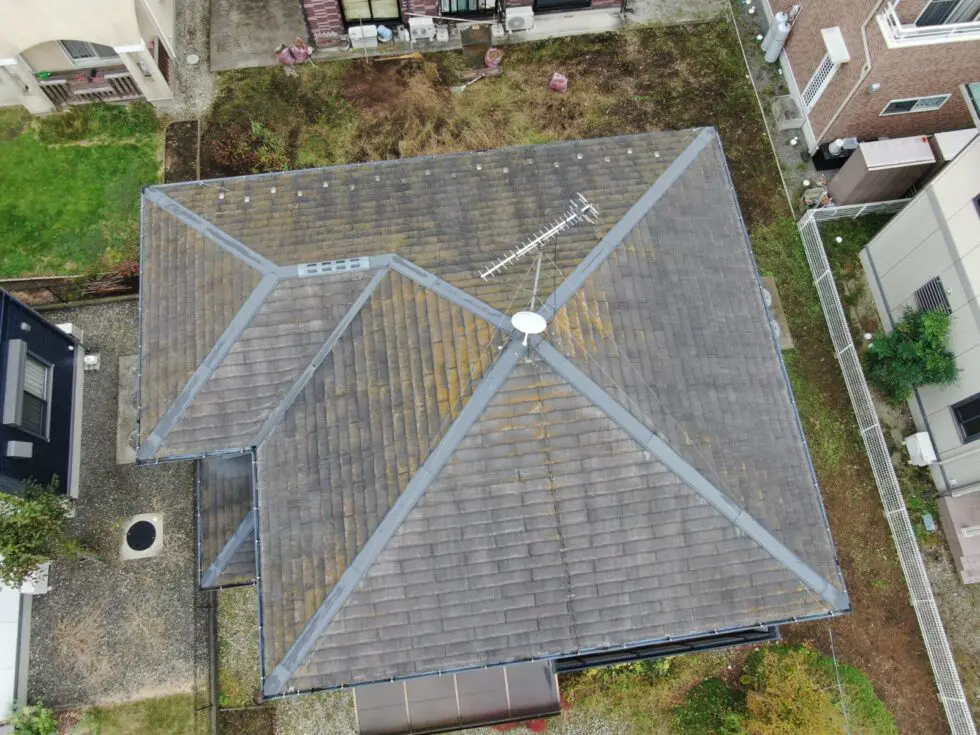 施工前は色が褪せ、苔や藻の繁殖も屋根全体にみられました。