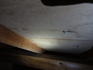 そのスレート瓦は、野地板と呼ばれる板に1枚あたり4本の釘を使って打ち付けてあります。