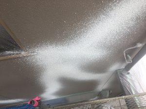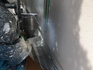 ひび割れ補修をしたところだけ、もともとのリシンの粒がない状態ですので、補修跡がフラットになって目立ってしまいます。この工程を行うことで、ひび割れを目立ちにくくします。