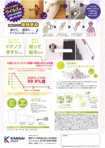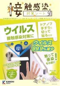 ドアノブや手すりはウイルスが付着しやすいですが、このシートを貼ることでウイルスを99.9%減少することができます。