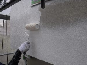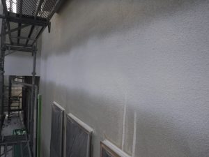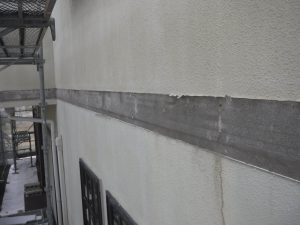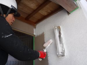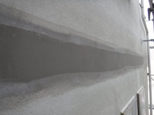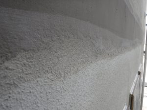 ひび割れ補修をしたところだけ、もともとのリシンの粒がない状態ですので、補修跡がフラットになって目立ってしまいます。この工程を行うことで、ひび割れを目立ちにくくします。