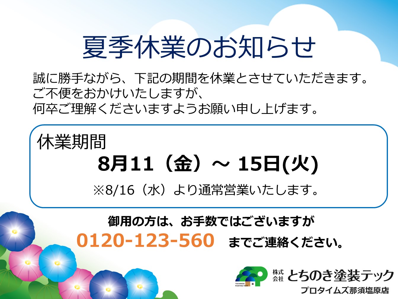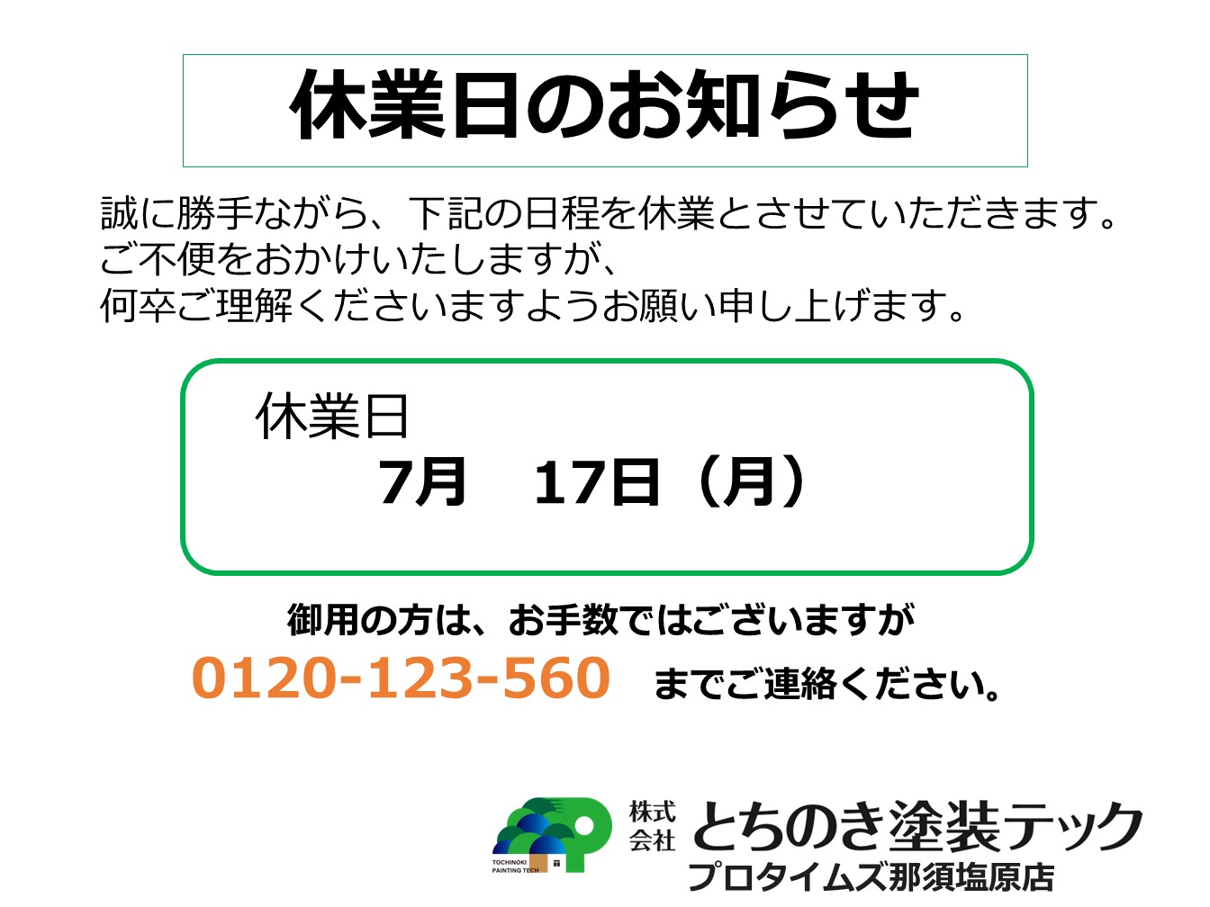 臨時休業のお知らせ(田子) 2023年07月10日(月) 那須塩原市の屋根塗装・外壁塗装はプロタイムズ那須塩原店へ! スタッフブログをご覧いただきありがとうございます。 栃木県那須塩原市の塗装会社 プロタイムズ那須塩原店 株式会社とちのき塗装テックの田子です。 本・・・