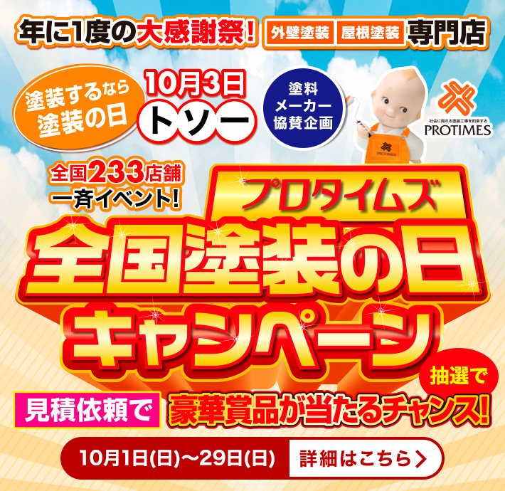 全国塗装の日キャンペーン開催中!! 2023年10月06日(金) 那須塩原市の屋根塗装・外壁塗装はプロタイムズ那須塩原店へ! スタッフブログをご覧いただきありがとうございます。 栃木県那須塩原市の塗装会社 プロタイムズ那須塩原店 株式会社とちのき塗装テックの田子です。 本・・・