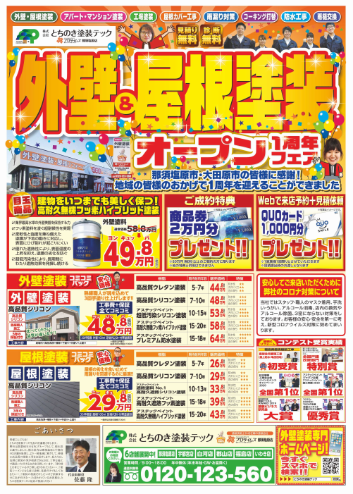 【那須塩原市】感謝を込めて!!オープン1周年フェア!!(田子)那須塩原市・大田原市・矢板市・那須町近辺の屋根塗装・外壁塗装ならとちのき塗装テック 2021年03月05日(金) 那須塩原市の屋根塗装・外壁塗装は(株)とちのき塗装テックへ! スタッフブログをご覧いただきありがとうございます。 (株)とちのき塗装テック(プロタイムズ那須塩原店)の田子です。 3月になりました! 暖かくな・・・