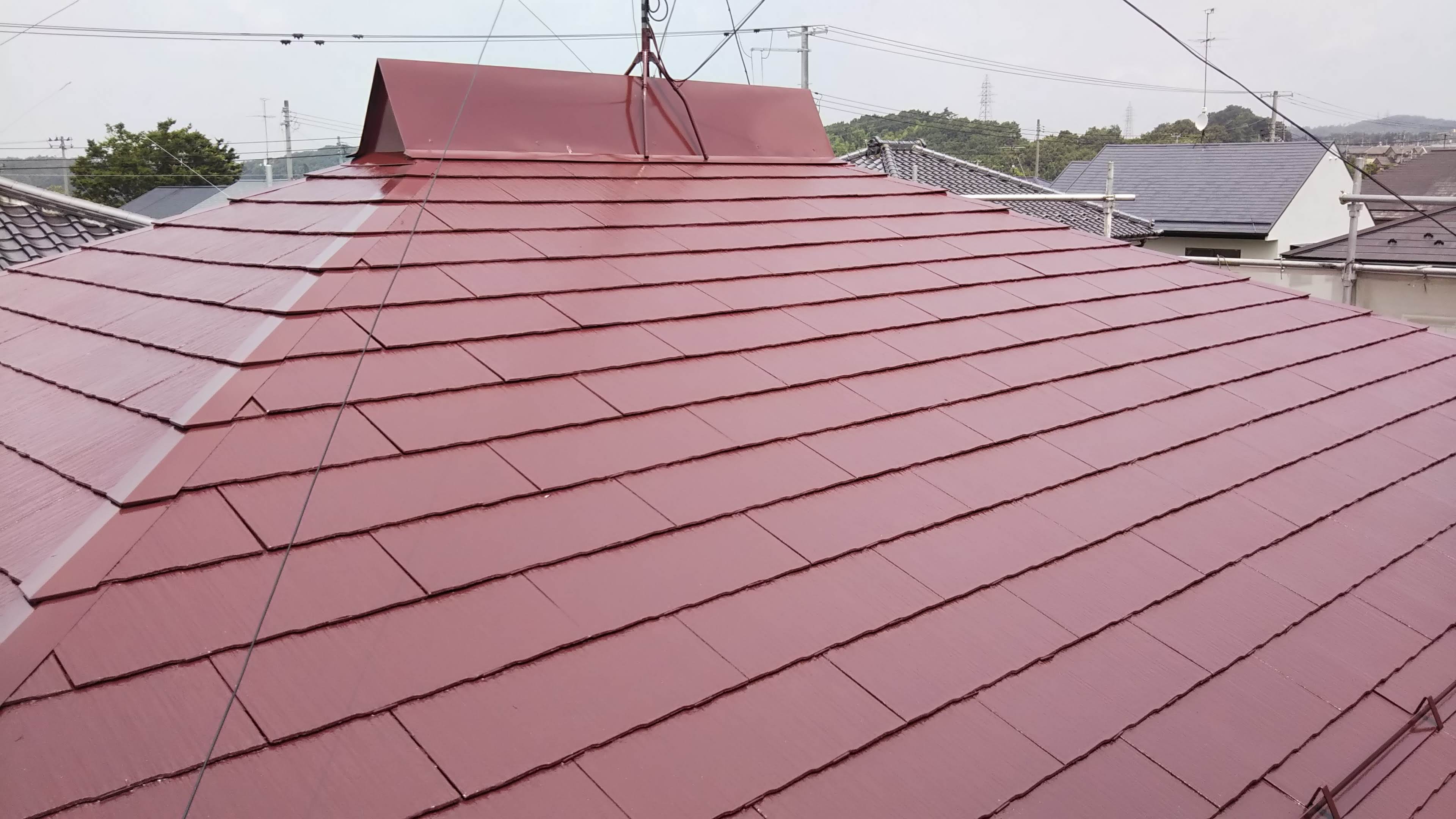 屋根塗装を行いました。スレート瓦(コロニアル)の屋根に赤い色で塗装して仕上げました。