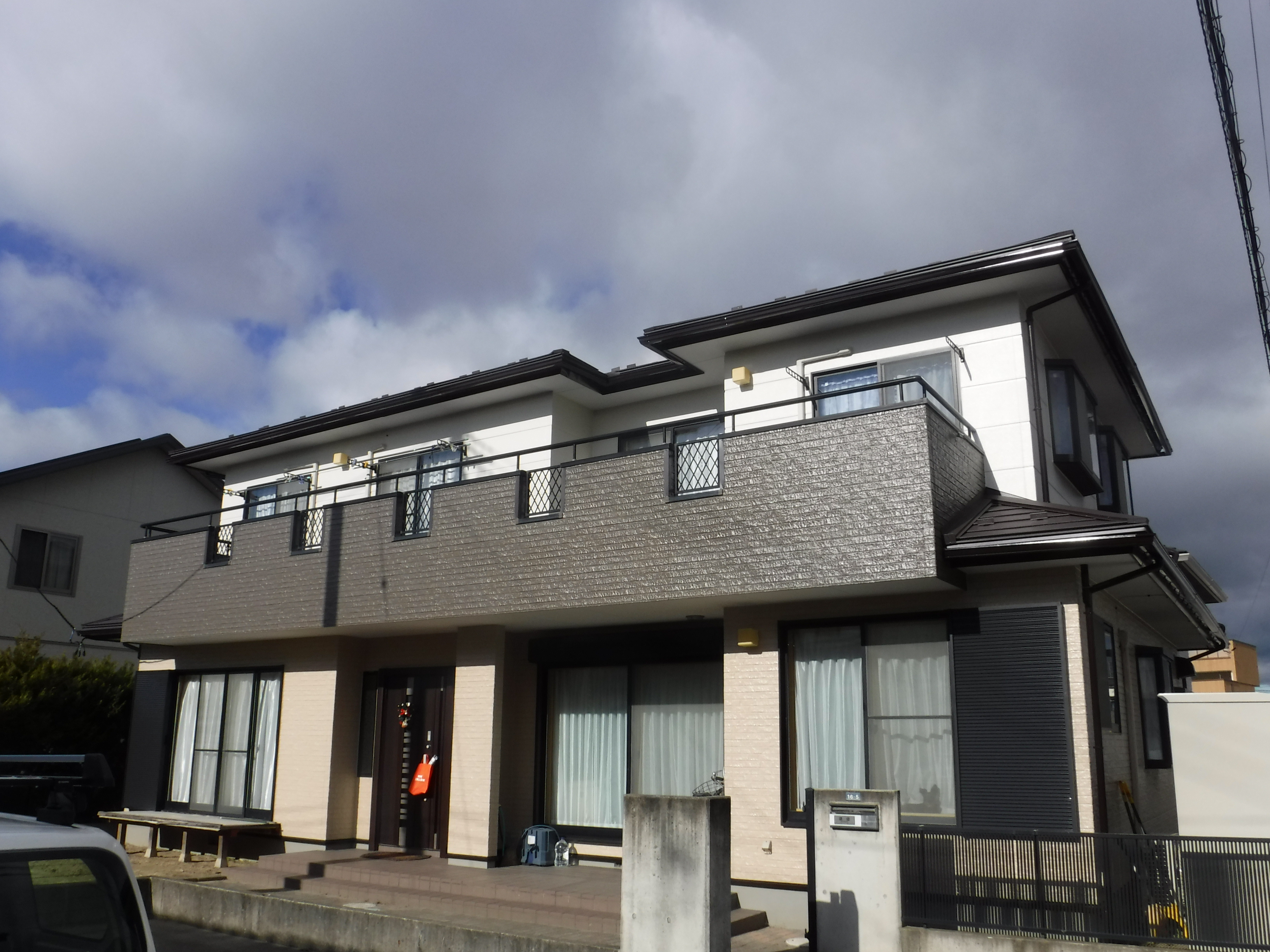 屋根は重ね葺き(カバー工法)、外壁は1階、2階、ベランダ部と3色で色分けしています。とても綺麗に仕上がりました。