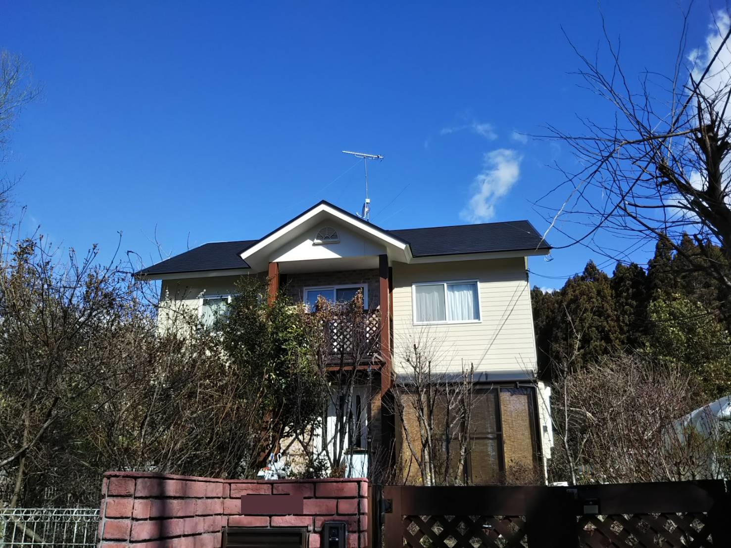屋根はカバー工事を行い、1階のタイル部分はクリヤー塗装、2階のサイディング部は、弊社一番人気の超低汚染プラチナリファイン2000MFを使用しました。きれいに仕上がり、よかったです。