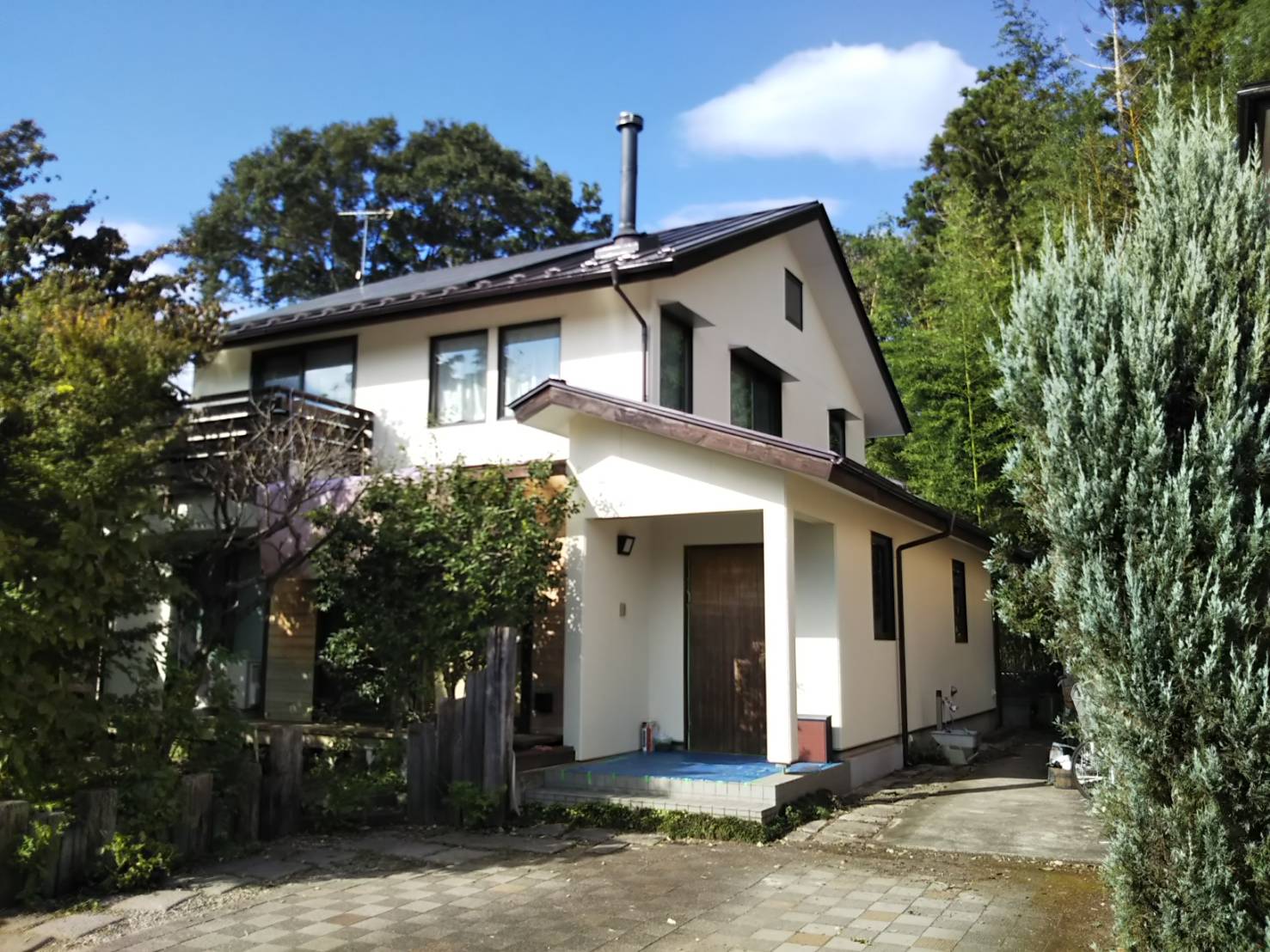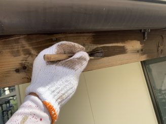 破風板の木の風合いを残せるように、木部保護塗料を使用しました。外壁がベージュ色になり、あたたかみのある外観になりました。