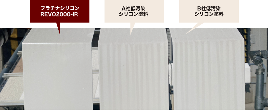 塗膜表面に汚れが付きにくい特殊構造のシリコン樹脂を採用。一般的な低汚染シリコン塗料と比較して雨筋汚れが付きにくく、塗り替え後の美しさを保持することが確認されています。